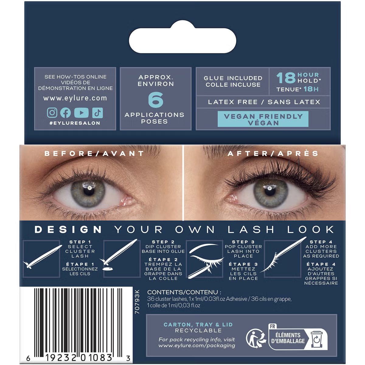 The Eylure Volume and Curl Dramatic Clusters elevate your eyes with enhanced length and dimension for a striking effect. Featuring 36 clusters that can be used up to six times each, they provide professional-quality curl and volume from the comfort of home. Carefully handcrafted and reusable, these lashes include latex-free adhesive that ensures a secure hold lasting up to 18 hours.