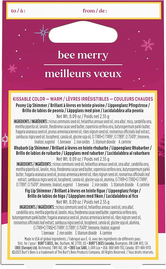 Ricinus Communis (Castor) Seed Oil, Helianthus Annuus (Sunflower) Seed Oil, Cera Alba [Beeswax], Candelilla Cera [Euphorbia Cerifera (Candelilla) Wax], Mentha Piperita (Peppermint) Oil, Lanolin, Mica, Theobroma Cacao (Cocoa) Seed Butter, CI 75470 [Carmine], Copernicia Cerifera (Carnauba) Wax, CI 77891 [Titanium Dioxide], Butyrospermum Parkii (Shea) Butter, Fragaria Ananassa (Strawberry) Seed Oil, Prunus Armeniaca (Apricot) Kernel Oil, Ribes Nigrum (Black Currant) Seed Oil, Rosmarinus Officinalis (Rosemary) Leaf Extract, Sambucus Nigra Seed Oil, Tocopherol, Canola Oil, Glycine Soja (Soybean) Oil, Alumina, CI 77491 [Iron Oxide], Eugenol, Limonene, Linalool.