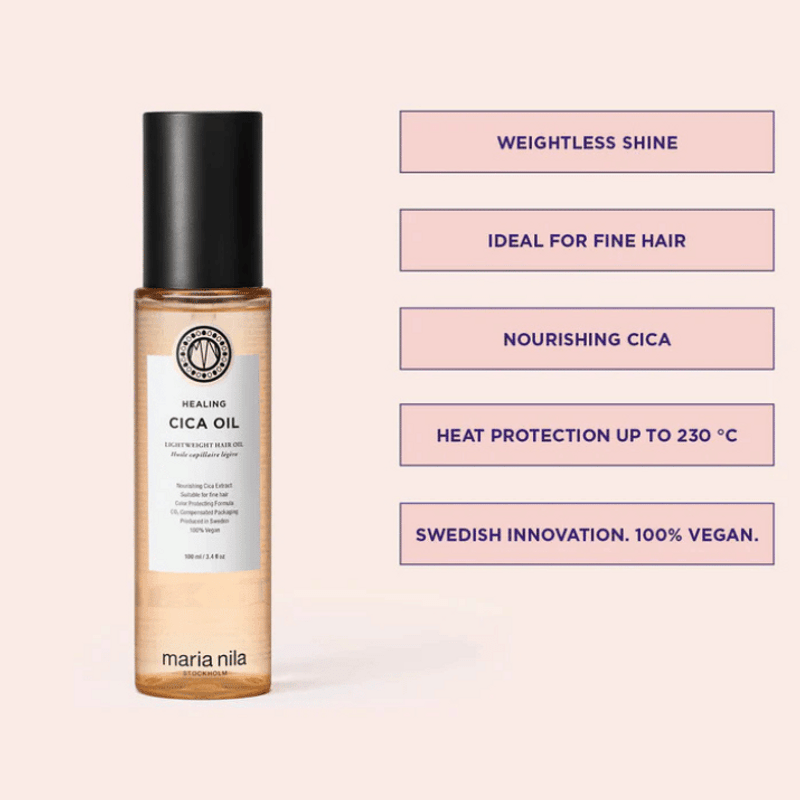 • Dispense 1–2 pumps of Maria Nila Cica Oil into your palms and apply evenly through damp or dry hair, focusing on mid-lengths and ends. Use before heat styling for protection or as a finishing touch for added shine and smoothness throughout the day.