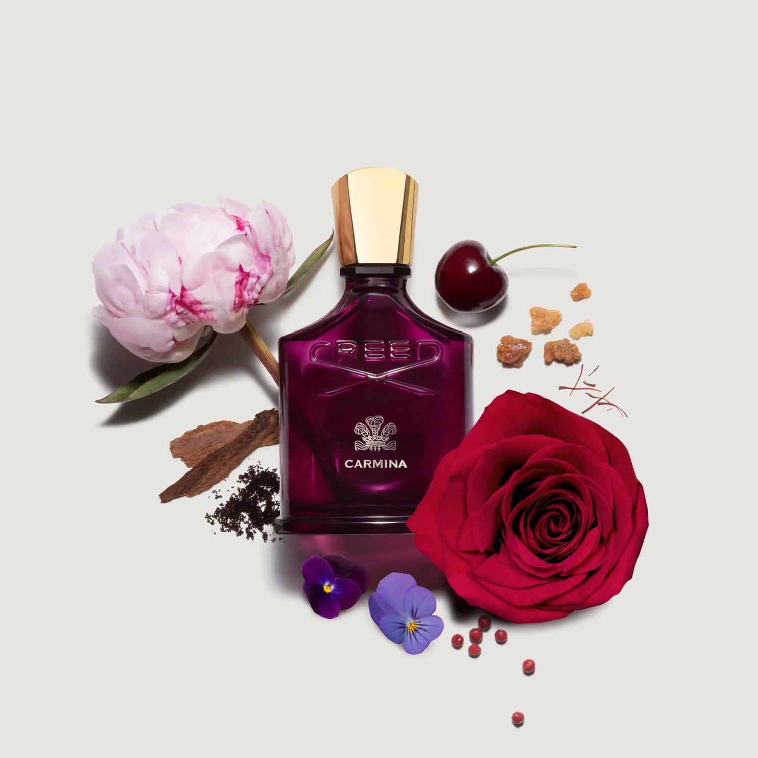 Experience Carmina, a captivating amber floral perfume by Creed. This women's fragrance opens with rose and black cherry, brightened by pink pepper and saffron, then settles into a sensual heart of cashmere wood. The deep base of myrrh, frankincense, amber and musk ensures a lasting, memorable finish.